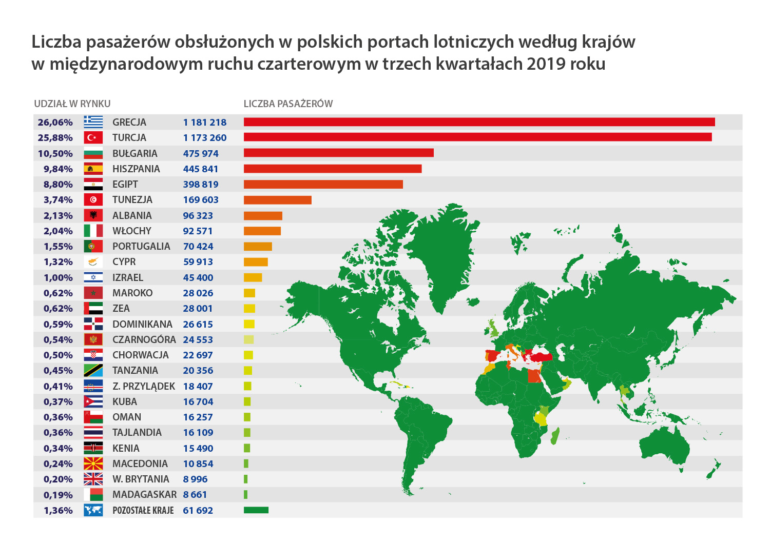 Щодо чартерних рейсів, то за три квартали 2019 року кількість пасажирів, які подорожували з і до польських летовищ, знизилась на 7,5%, або на 367 тисяч осіб. Минулоріч найпопулярнішими напрямками були Греція, Туреччина та Болгарія.