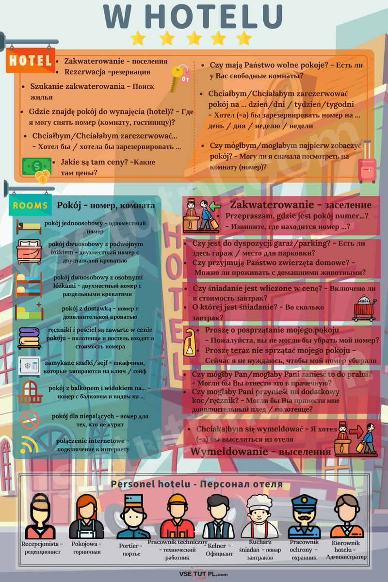 Перечень фраз на польском языке с переводом, которые могут понадобиться при поиске и резервации номера в отеле в Польше: